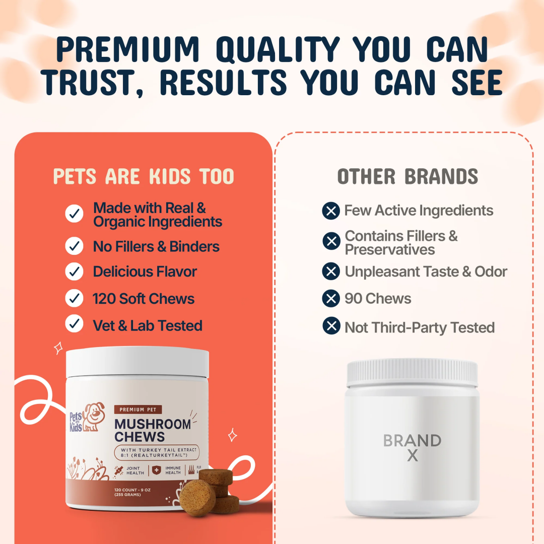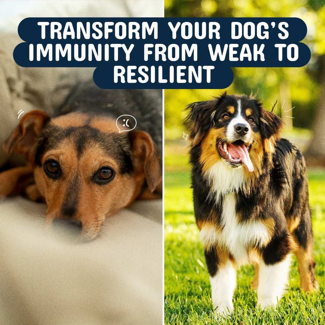 Strengthen your dog's natural defenses with our potent blend of organic mushrooms. Featuring Reishi, Real Turkey Tail, Lion’s Mane, and Turmeric, this scientifically backed formula supports a resilient immune system, helping your pet stay healthy and active through seasonal changes, environmental stressors, and everyday adventures.